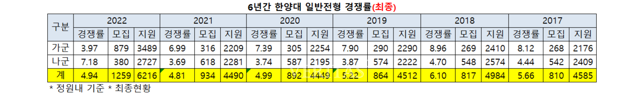 [베리타스알파=유다원 기자] 3일 오후6시 정시 원서접수를 마감한 한양대의 최종 경쟁률은 정원내 기준 4.94대1로 나타났다. 가/나군 합산 1259명 모집에 6216명이 지원한 결과다. 모집군 별로는 가군이 3.97대1(879명/3489명), 나군이 7.18대1(380명/2727명)을 기록했다. 지난해 4.81대1(934명/4490명)보다 상승했다. 모집인원이 325명 늘고, 지원인원은 1726명 큰 폭 오르며 전체적인 경쟁률이 상승세를 보였다.