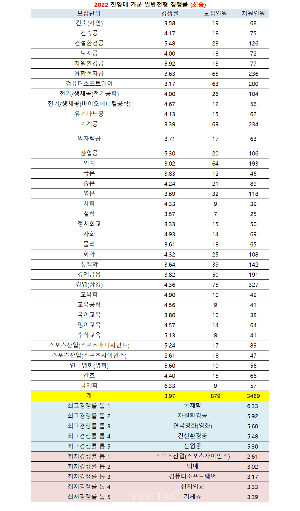 3일 오후6시 2022정시 원서접수를 마감한 한양대는 연극연출/연기가 10일, 성악/피아노가 17일 1단계 합격자를 발표한다. 예능계열 실기고사는 15일부터 20일까지 진행되며, 체능계열 실기고사는 27일로 예정돼 있다. 최초 합격자 발표는 가군이 21일, 나군이 2월8일이다. 합격자 등록기간은 2월9일부터 11일까지며, 추가 합격자 발표는 2월14일부터 2월20일 오후9시까지 진행된다.