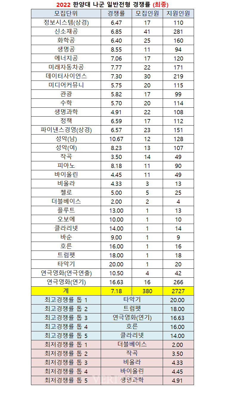 최저경쟁률은 나군 더블베이스다. 2명 모집에 4명이 지원하며 2대1이다. 나군에서는 작곡3.5대1(14명/49명) 비올라4.33대1(3명/13명) 바이올린4.45대1(11명/49명) 생명과학4.91대1(22명/108명)까지 5대1 미만의 경쟁률을 기록했다.