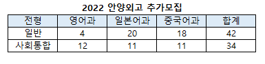 [베리타스알파=김하연 기자] 안양외고는 2022학년 신입생 추가모집을 진행한다고 최근 밝혔다. 모집인원은 정원내 기준 일반42명, 사회통합 34명, 총76명이다. 일반은 영어과4명, 일본어과20명, 중국어과18명을, 사회통합은 영어과12명, 일본어과11명, 중국어과11명을 모집한다.