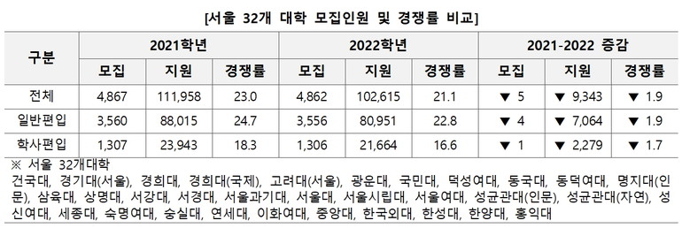 2022학년 편입지원결과가 발표됐다. ㈜아이비김영 진로진학연구소 분석에 따르면 서울지역 32개 대학의 편입 전체(일반, 학사) 모집인원은 4862명에 1만2615명이 지원해 평균 21.1대1의 경쟁률을 나타냈다. 일반편입은 3556명 모집에 8만951명이 지원해 22.8대1의 경쟁률을 기록했고, 학사편입은 1306명 모집에 2만1664명이 지원해 16.6대1의 경쟁률을 보였다. 전년에 비해 일반편입 경쟁률은 1.9대1(2021학년 24.7대1), 학사편입 경쟁률은 1.7대1(2021학년 18.3대1)이 낮아졌으며, 편입 전체(일반, 학사)로도 1.9대1(2021학년도 23.0대1) 정도 낮아졌다. 편입문호가 넓어지면서 전반적으로 경쟁률은 낮아지는 추세다. 얼핏보면 경쟁률이 높아보이지만 실제는 다르다. 대입경쟁률과 달리 편입은 지원횟수의 제한이 없고 중복지원이 가능하기 때문이다. 통상 8~10개 대학을 중복지원한다. 결국 편입경쟁률의 착시효과를 걷어내면 실질경쟁률은 3대1 안팎이라는 게 전문가들 시각이다.