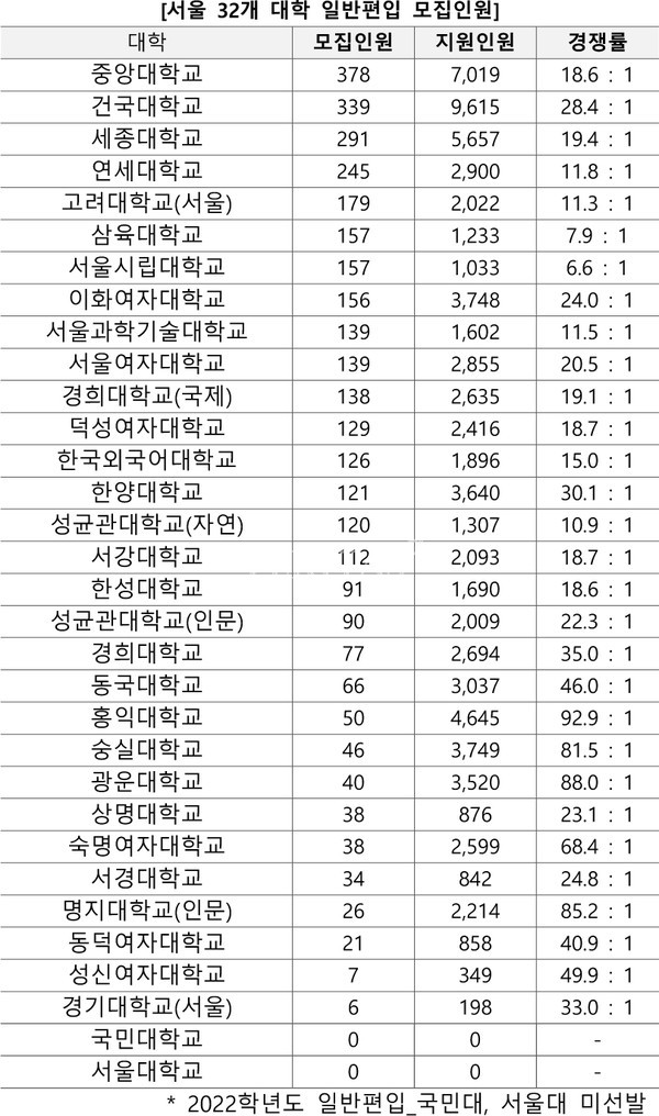 <일반편입 규모 중앙대 '최다' 378명...건대 세종대 연대 고대순>