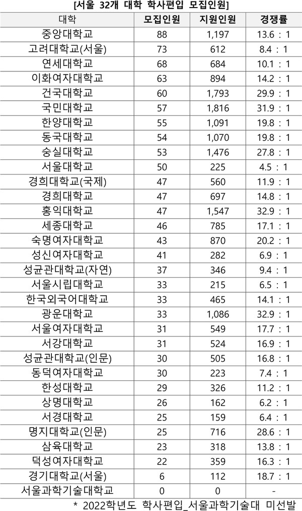 학사편입 역시 중앙대가 88명 모집으로 가장 많은 인원을 선발했다. 이어 고려대(73명) 연세대(68명) 이화여대(63명) 건국대(60명) 순이었다. 학사편입 경쟁률은 홍익 32.9대1(47명 모집 1547명 지원), 광운 32.9대1(33명 모집, 1086명 지원), 국민 31.9대1(57명 모집 1816명 지원), 건국 29.9대1(60명 모집, 1793명 지원), 명지 인문 28.6대1(25명 모집 716명 지원) 순이었다.