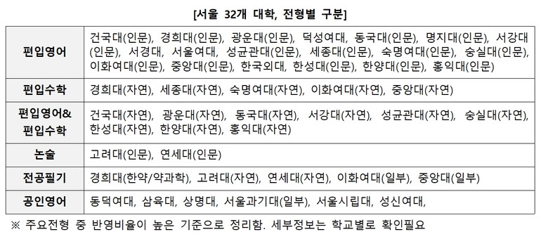 <편입 서울 32개 대학...대부분 편입영어 또는 편입영어, 편입수학으로 선발>