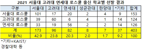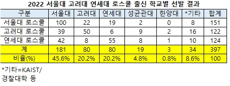 [베리타스알파=한정현 기자] ‘SKY’로 불리는 서울대 고려대 연세대 로스쿨의 2022학년 신입생 선발 결과를 종합한 결과 SKY대학 출신이 전체 모집인원 397명 중 341명(85.9%)를 차지하는 것으로 15일 나타났다. 전년 87.1%보다 1.2%p 감소했다. 서울대 출신이 181명(45.6%)으로 가장 많고, 고려대 80명(20.2%), 연세대 80명(20.2%) 순이다. 전년의 경우 403명 중 서울대 173명(42.9%), 고대 96명(23.8%), 연대 82명(20.3%)로 351명이었다. 총 합격자 수로 따지면 351명에서 341명으로 10명 감소했다.
