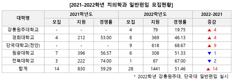 치의학과는 2022학년 단국대(천안)에서 일반편입 모집을 처음 실시하면서 총 모집인원이 28명으로 전년 대비 일반편입 모집인원이 100% 증가했다. 단국대(천안)이 일반편입으로 9명을 모집하면서, 2022학년 치의학과 모집 대학은 다시 5개로 늘어났다. 이밖에 2021학년 일반편입 모집인원이 없었던 강릉원주대도 4명을 모집하고, 경희대도 전년 대비 4명 증가한 8명을 모집했다. 학사편입은 강릉원주대와 원광대에서 총 4명을 모집했다.
