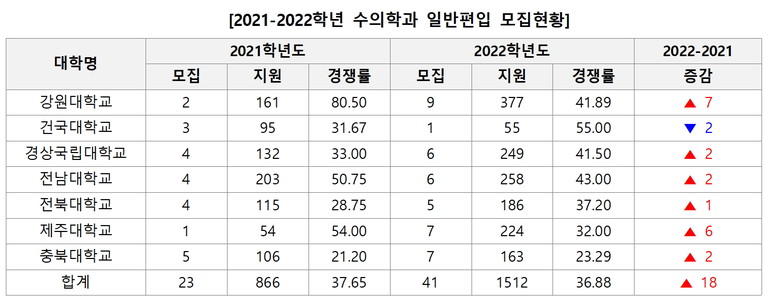 수의학과는 매년 모집인원이 증가하고 있으며, 2022학년에는 전년 대비 78.3% 증가한 41명을 일반편입으로 모집했다. 전국 10개 수의학과 중 10개 대학 모두 일반편입을 모집을 했으며, 2022학년에는 건국대를 제외하고 모든 대학에서 모집인원이 늘어났다. 모집규모도 큰편이어서 대학마다 5~9명을 모집하며, 특히 전년 대비 강원대와 제주대에서 크게 증가했다. 학사편입은 모든 대학에서 선발하며 총 모집인원 15명으로 작년과 동일한 인원을 모집했다.