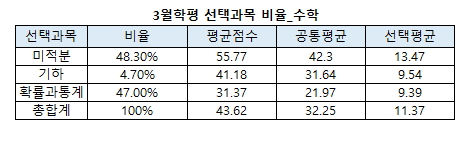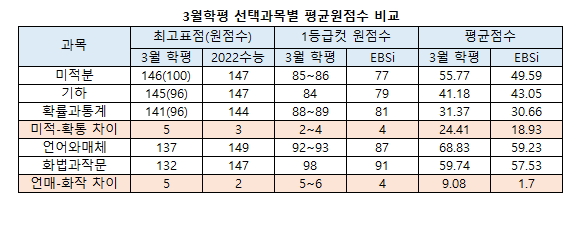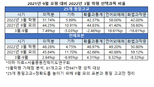 연구회 관계자는 “수학의 경우 학습에 충분한 시간이 필요해 대부분의 학생이 이미 겨울방학부터 선택과목에 대한 학습을 진행한다는 점을 고려해볼 때 3월학평에서 나타난 경향성은 2023수능에서도 유지될 것으로 전망된다”고 분석했다.