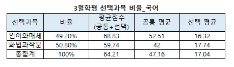 미적과 기하를 합산해도 지난해 9월모평보다 2.46%p 증가했다. 미적+기하는 지난해 9월모평 때도 이미 55.22%로 문과생을 추월했지만 올해 3월학평에서는 57.63%로 증가 양상이다. 반대로 문과생들이 주로 응시하는 확통은 올해 3월학평에서 42.37%로 지난해 9월모평 44.83%보다 감소했다. 국어에서도 선택과목 유불리에 따른 이동이 확연하다. 지난해 9월모평에서 언매를 선택한 학생은 41.4%였지만, 올해 3월학평에선 58%로 무려 16.61%p 증가했다.