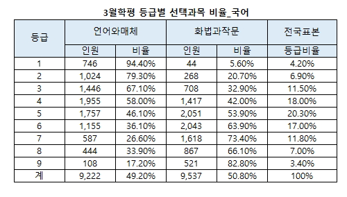 국어에서 언매 1등급 비율은 94.4%다. 반면 화작은 5.6%다. 2등급 역시 언매 79.3%, 화작 20.7%로 언매에서 고득점을 받은 학생이 상대적으로 1,2등급 획득에 유리한 것으로 나타났다.