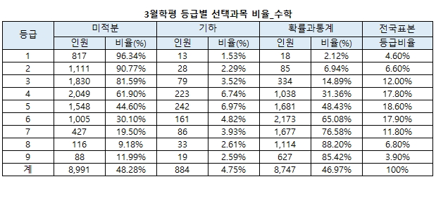 지난해 수능의 학습효과로 선택과목별 유불리 우려가 증폭되며 수학에서 미적을 택한 학생이 더 늘어난 것으로 조사됐다. 지난해 9월모평과 비교하면 미적을 선택한 비율은 7.49%p 증가했다. 지난해 9월모평에서 미적을 택한 학생은 44.25%였지만 올해 3월학평에선 51.75%로 늘며 절반을 넘겼다.