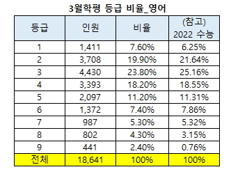 영어 1등급 비율은 7.6%다. ‘불수능’으로 치러진 지난해 수능의 영어 1등급 비율인 6.25%보다 1.35%p 증가했다. 이어 2등급 19.9%(2022수능 21.64%), 3등급 23.8%(25.16%), 4등급 18.2%(18.55%), 5등급 11.2%(11.31%), 6등급 7.4%(7.86%), 7등급 5.3%(5.32%), 8등급 4.3%(3.15%), 9등급 2.4%(0.76%)로 나타났다.