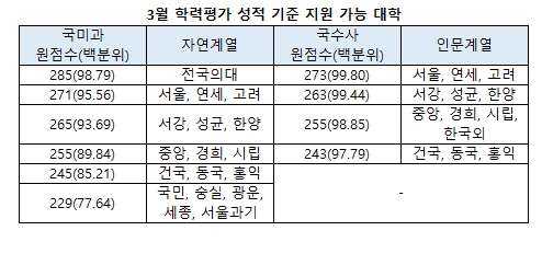 연구회는 3월학평 성적을 기준으로 계열별 상위대학 합격선도 공개했다. 자연계의 경우 전국 의대 합격선은 원점수 285점, 백분위 98.79로 나타났다. 이어 서울대 연세대 고려대 등 일명 SKY는 271점(백분위 95.56)이다.