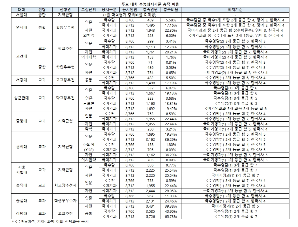이어 “절대평가로 등급을 산출하는 영어는 지난해 수능과 같이 올해 3월학평에서도 높은 난도를 유지했다”며 “따라서 영어를 필수 반영하는 고려대 학업우수형 인문(국수탐 응시자 충족비율 0.81%), 연세대 국제형 국제(국수탐 응시자 충족비율 2.58%), 중앙대 지역균형 약학(국미기과 응시자 충족비율 3.21%) 등의 모집단위에서 낮은 수능최저 충족비율을 보였다”고 분석했다.