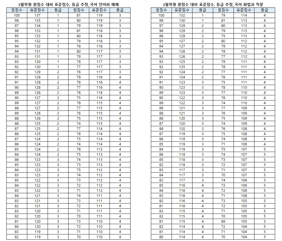 국어에서도 3월모평에서 언매 최고 표점은 137점인 반면, 화작은 132점으로 5점 차이가 난다. 지난해 수능의 표점 격차와 비교하면 3점 늘었다. 지난해 수능에서는 언매 149점, 화작 147점으로 2점 차이였다.