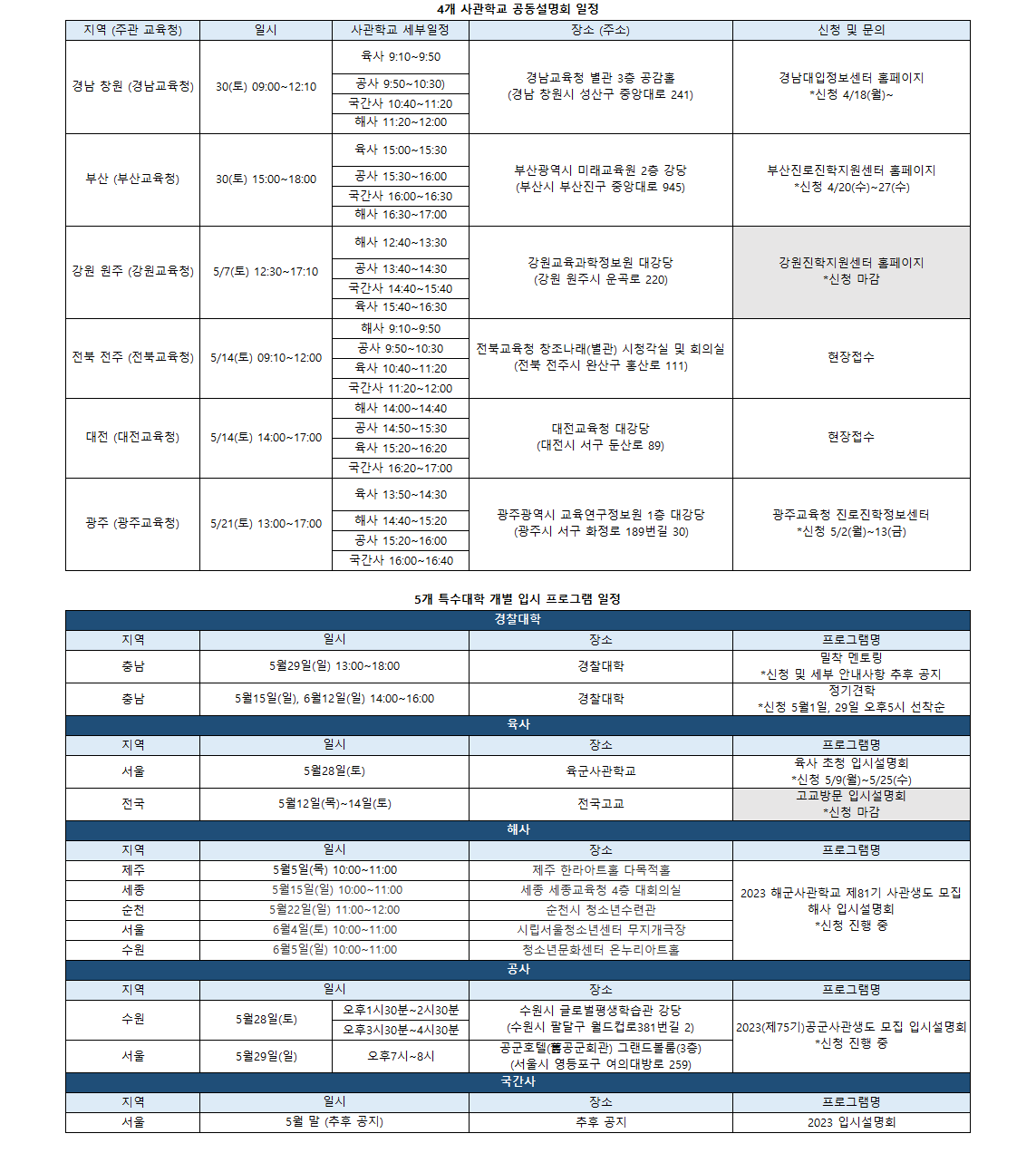 4개 사관학교(육사 해사 공사 국간사)는 올해 합동 지역 입시설명회를 진행한다. 사관학교 입시에 관심있는 학생 학부모 교사라면 누구나 참석할 수 있다. 설명회는 8개 시/도 교육청에서 주관한다. 각 설명회에서 4개 사관학교가 40분씩 2023대입을 소개할 예정이다.