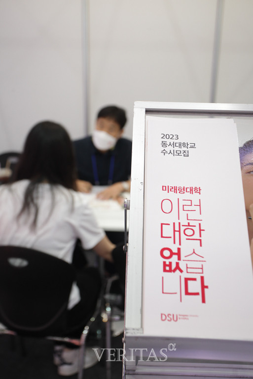 [베리타스알파=신현지 기자] 21일 동서대 박람회 부스에서 한 학생이 상담을 받고 있다. 2023수시박람회는 20일부터 23일까지 나흘간 서울 삼성동 코엑스 1층 A홀에서 진행된다.