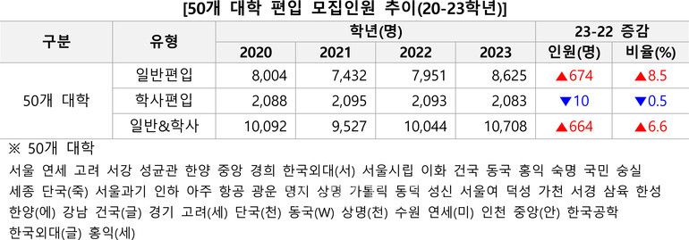 2023학년은 50개 대학 기준으로 편입 모집인원이 1만708명(일반편입 8625명, 학사편입 2083명)으로 전년의 1만44명(일반편입 7951명, 학사편입 2093명)보다 664명(6.6%)이 증가했다. 첨단산업학과 이슈 이전인 2020학년 1만92명(일반편입 8004명, 학사편입 2088명)보다도 616명 증가했는데 21학년 565명 감소 후 매년 평균 591명씩 증가하는 추세다.