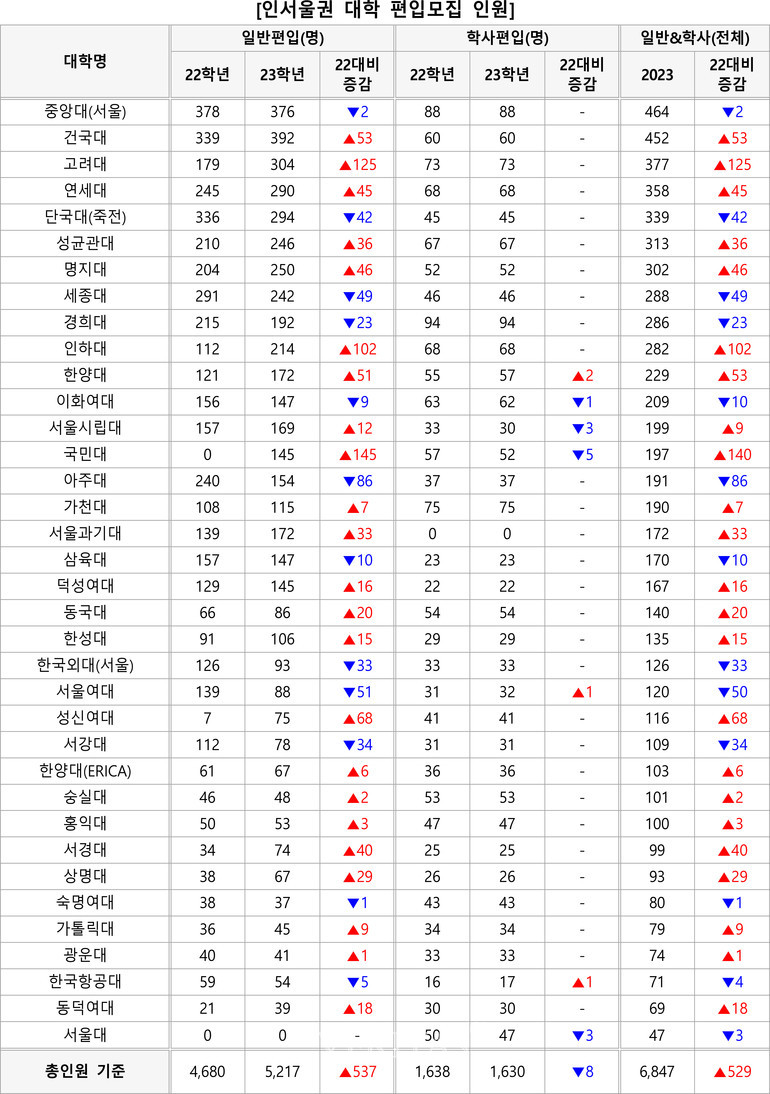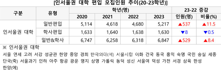 선발인원 기준으로 중앙대(서울)가 464명(일반편입 376명)으로 가장 많았고, 다음으로 건국대 452명(일반편입 392명), 고려대 377명(일반편입 304명) 순이었다. 인원증가가 가장 많았던 대학은 국민대로 140명 증가했다. 국민대는 첨단산업학과 이슈로 22학년에는 일반편입을 선발하지 않았으나 23학년에는 140명을 선발했다. 다음으로는 고려대 125명, 인하대 102명 순이었다.