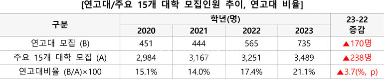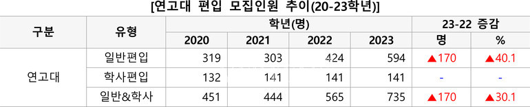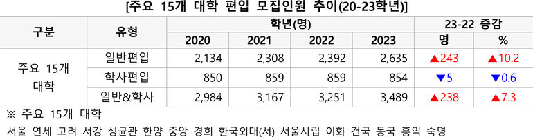 2023학년 연고대 편입모집 인원은 일반편입 594명으로 전년 대비 170명(40.1%) 증가, 일반&학사 전체 모집인원은 735명으로 전년 565명보다 30.1% 증가한 수치를 나타냈다. 주요 15개 대학은 3489명(일반 2635명, 학사 854명)을 모집하여 전년 3251명보다 238명(7.3%) 증가했다. 특히, 주요 15개 대학 중 연고대 모집인원이 차지하는 비율 21.1%로 전년에 비해 3.7%p 증가했다.