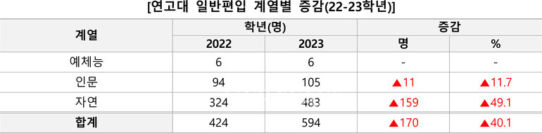 실제로 2023학년도 연고대 일반편입 계열별 증감을 살펴보면 인문계열은 105명으로 전년대비 11명(11.7%) 증가했지만, 자연계열은 485명으로 전년대비 159명(49.1%)이나 증가하여 자연계열 편입공간이 크게 확대된 것을 알 수 있다.