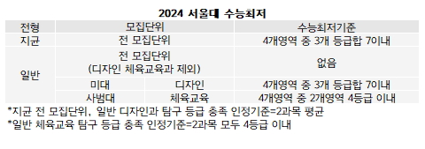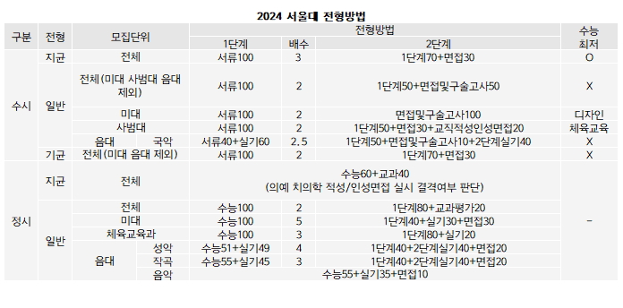서울대는 수시 기균(사회통합)을 신설해 정원내 159명을 모집한다. 4.8% 규모다. 기존에도 기균이 있었지만 그간 정원외로 모집하던 걸 2024학년에는 정원내로 모집한다. 미대 음대를 제외한 모집단위 기준, 서류100%로 2배수를 통과시킨 뒤 1단계70%+면접30%로 선발한다.