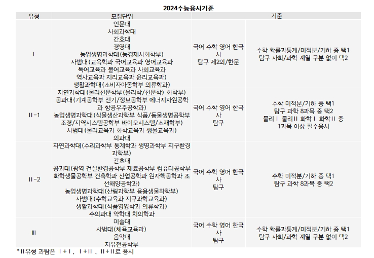 자연계 수능 응시영역 기준에 변화가 있다는 점에도 유의해야 한다. 유형2에서 지난해인 2023학년까지는 과탐에서 서로 다른 분야의 Ⅰ+Ⅱ 또는 Ⅱ+Ⅱ를 선택하도록 해 과탐Ⅱ 응시를 의무화했지만 2024학년에는 Ⅰ+Ⅰ, Ⅰ+Ⅱ, Ⅱ+Ⅱ 세 조합 중 선택할 수 있도록 한다. 다만, 과탐Ⅱ 과목 응시를 장려하기 위해 과탐 응시 조합 유형에 따른 조정 점수를 부여한다. Ⅰ+Ⅱ 조합은 3점, Ⅱ+Ⅱ 조합은 5점이 부여된다. Ⅰ+Ⅱ 조합은 서로 다른 분야의 과목을 응시해야 하는 점은 그대로 유지된다. 유형2가 2-1, 2-2로 세분화되는 변화도 있다. 유형2-1은 물Ⅰ 물Ⅱ 화Ⅰ 화Ⅱ 중 1개 과목 이상을 반드시 응시해야 한다.