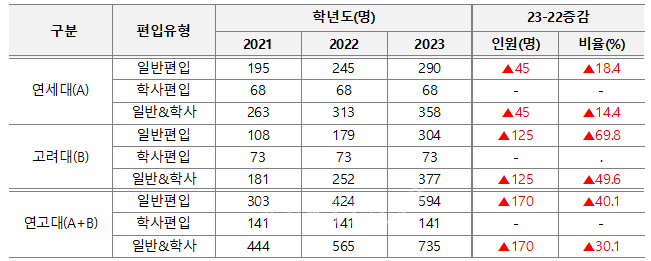 현 대입(신입학)에서의 의약학계열 쏠림현상이 편입학 최상위권에도 큰 영향을 주고 있다. 최근 중도탈락자(자퇴 등)가 늘면서 국내 최상위권 대학인 연고대에도 편입모집 정원이 급증했다. 2023학년 기준으로 연세대 편입은 358명(일반편입 290, 학사편입 68)을, 고려대 377명(일반편입 304, 학사편입 73)을 모집하여 전체 735명을 선발했다. 이는 전년도에 비해 30.1% 증가한 수치이며 일반편입만으로는 40.1%가 증가한 수치다.