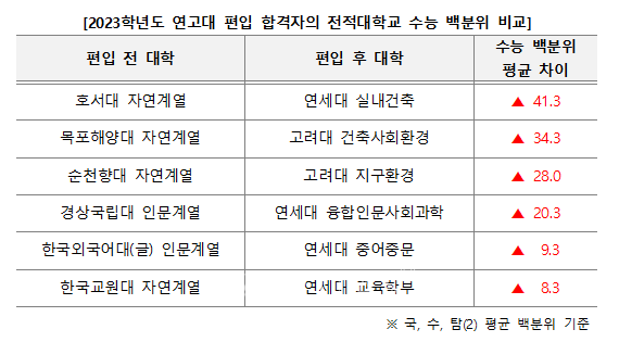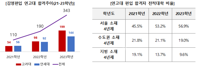김영편입 진로진학연구소에서 김영편입 연고대 합격 643건(2021~2023학년, 중복포함)을 조사한 결과 인서울 소재 대학의 비율이 매년 증가하는 결과가 나타났다. 2023학년도 연고대 편입합격자 중 전적대가 서울소재 4년제 대학인 경우는 56.9%로 2021학년 대비 전년대비 11.4%p 증가한 반면, 지방소재 4년제 는 9.6%로 2021학년 대비 9.5%p 감소했다. 이러한 이유는 논술이나 전공시험 등 연고대 전형이 가지는 특징과 모집규모 증가에 따라 연고대에 진입하지 못한 중상위권 학생들이 편입학을 통해 진입하였기 때문으로 보인다.