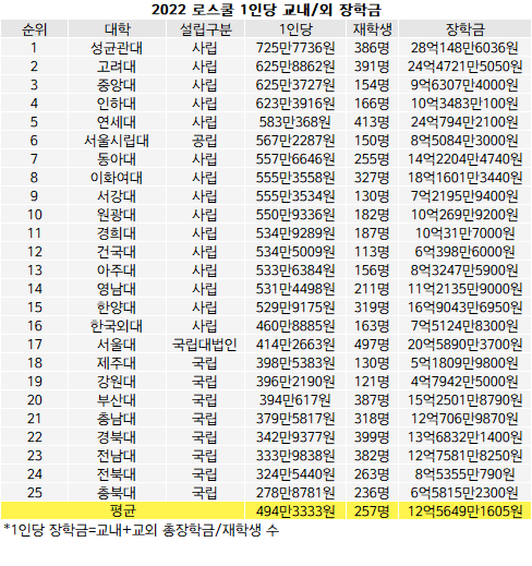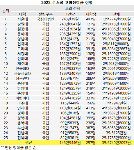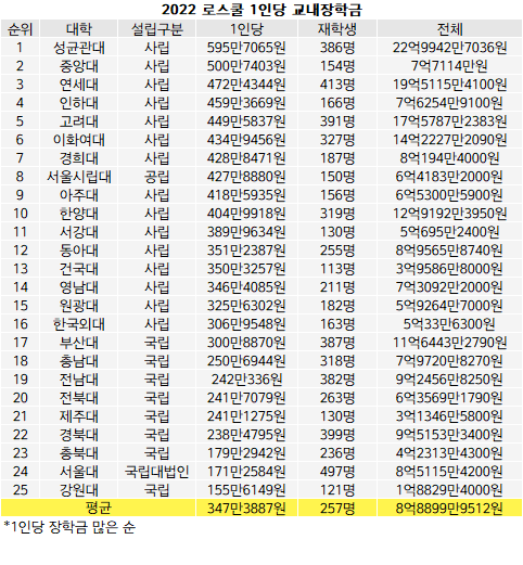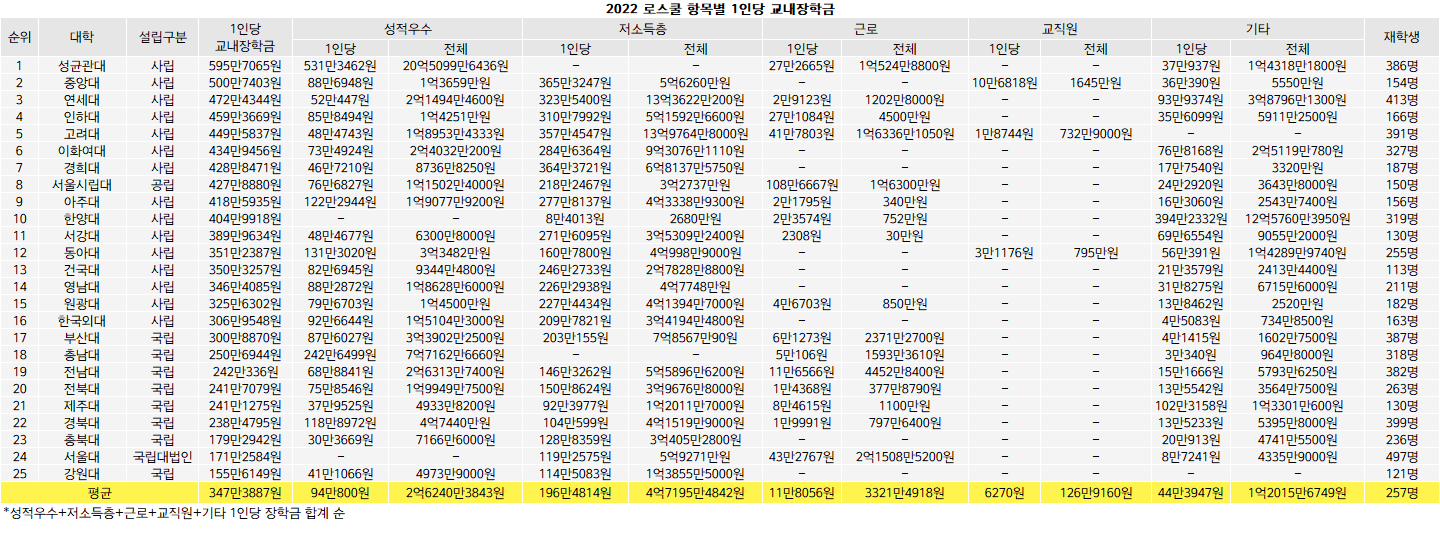 교내장학금 기준으로도 성대의 지급액이 가장 컸다. 2022년 한해 1인당 595만7065원을 지급했다. 항목별로 살펴보면 성적우수장학금이 대부분을 차지했다. 성적우수 531만3462원, 근로 27만2665원, 기타37만937원이다. 2위는 중앙대로 500만7403원이다. 저소득층 장학금이 365만3247원으로 가장 많았고, 이어 성적우수 88만6948원, 기타36만390원, 교직원 10만6818원 순으로 많았다. 연세대가 1인당 472만4344원을 지급해 톱3를 기록했다. 세부 항목은 저소득층 323만5400원, 기타 93만9374원, 성적우수 52만447원, 근로 2만9123원이다.