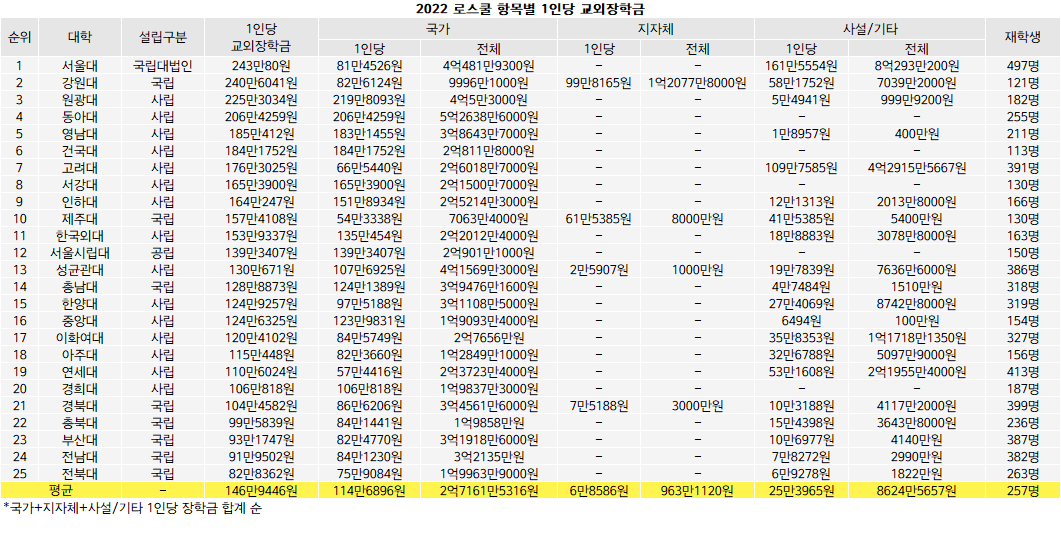 <1인당 교외 장학금 서울대 1위.. 강원대 원광대 동아내 영남대 순 >