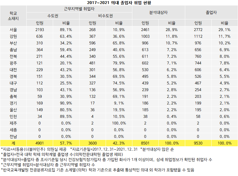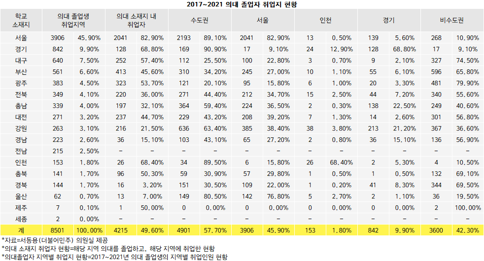 최근 5년간(2017~2021) 전국 의대를 졸업한 학생의 취업 현황을 분석한 결과, 수도권 쏠림 현상이 두드러지게 나타났다. 서동용 의원이 교육부로 받은 전국 의대 졸업생 취업 현황을 분석한 결과, 의대 졸업생 중 상세 취업 정보가 확인된 취업자 8501명의 57.7%인 4901명이 수도권에 취업한 것으로 확인됐다. 이 중 서울에 취업한 인원이 3906명으로 대부분을 차지한다. 전체 취업자의 45.9%를 차지하는 비중이다.