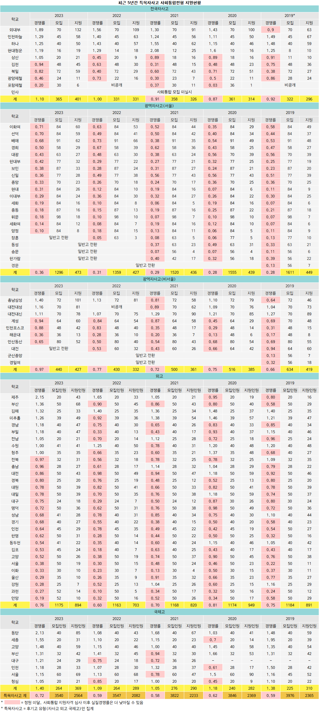 2010학년 사통 20% 도입 이후 자사고와 특목고의 정원 미달은 10년이 넘는 고질적인 문제로 꼽혀왔다. 지난해 역시 외고 30개교 중 21개교, 서울 광역자사 16개교 중 16개교, 전국자사 10개교 중 4개교, 비서울 광역자사 7개교 중 4개교가 사통에서 미달을 빚었다. 특히 서울 광역자사 16개교는 2016학년 이화여고가 유일하게 1.18대1(모집 84명/지원 99명)로 1대1을 넘긴 이후 최근 7년 동안 단 한 번도 모집 인원을 채우지 못했다. 정원의 20%로 규정한 사통 모집 인원을 16개교나 되는 서울 광역자사가 모두 흡수할 수 없는 구조적 한계 때문이다. 외고 역시 상황이 다르지 않다. 서울에 소재한 대원외고와 한영외고, 인천에 소재한 인천외고의 경우 최근 5년간 일반전형에서 매년 1대1 이상의 경쟁률을 보여왔지만, 사통에서는 단 한 번도 정원을 채우지 못했다. 한 자사고 관계자는 “사통 모집 인원을 채우기 위해 각종 장학금을 전폭적으로 지원하는 등 많은 노력을 기울이고 있지만 역부족”이라고 한탄했다.
