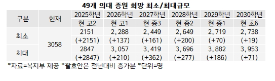 의대정원 확대 수요조사 결과에 따르면 현 정원인 3058명 대비 전국 의대에서 제시한 2025학년도 증원 수요는 최소 2151명에서 최대 2847명으로 나타났다. 각 대학은 정원을 지속적으로 확대해 2030학년까지 최소 2738명에서 최대 3953명의 추가 증원을 요청한 것으로 나타났다. 복지부 관계자는 “최소 수요는 각 대학이 교원과 교육시설 등 현재 보유하고 있는 역량만으로 충분히 양질의 의학교육이 이루어질 수 있다고 판단한 것으로, 바로 증원이 가능한 규모를 의미한다. 최대 수요는 대학이 추가 교육여건을 확보하는 것을 전제로 제시한 증원 희망 규모를 의미한다”고 설명했다.