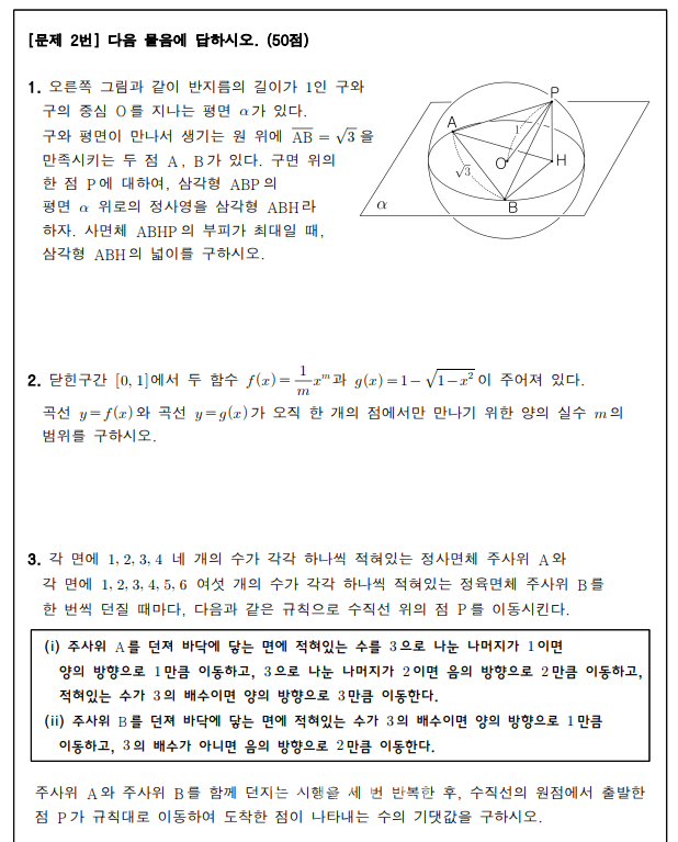 자연계열 문제2 역시 3개의 소문항으로 구성되어 있다. 소문항1번은 공간도형에 대한 기본적인 지식을 바탕으로, 미분법의 도구를 적절히 활용해서 주어진 도형의 넓이를 구할 수 있는가를 묻고 있다. 2번은 두 곡선의 교점을 미분법, 사잇값의 정리 등을 이용해 구할 수 있는가를 묻고 있다. 3번은 독립 사건의 확률을 계산하여 확률변수의 기댓값을 구할 수 있는가를 묻고 있다.