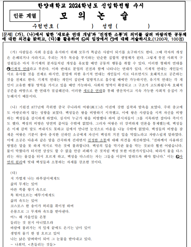 한양대는 8월 입학처 홈페이지를 통해 2024학년 논술 대비를 위한 모의논술 문항과 출제의도/평가지침 예시답안을 공개했다.