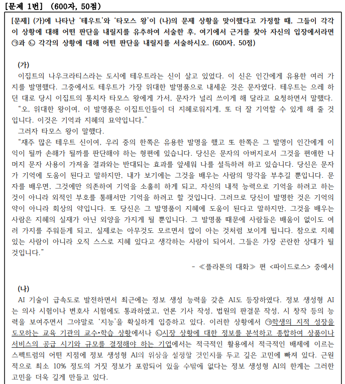 상경계열은 2문제가 출제됐다. 1번은 인문논술, 2번은 자연논술 형태다. 1번 문제는 고전 중에서도 손꼽히는 ‘플라톤의 대화’ 편에 있는 <파이드로스>에서 테우트 신과 타모스 왕의 대화가 주는 시사점을 취해 최근에 급속도로 발전하고 있는 정보 생성형 AI에 대해 어떻게 대응할 수 있는지, 어떤 대응이 바람직한지에 대해 주체적으로 자신의 의견을 서술할 수 있는 능력이 있는지를 측정하고자 했다. 지문 (가)에는 문자의 역할을 쟁점으로 해 그것이 과연 인간을 더 지혜롭게 만들고 더 잘 기억하게 만드는 데 기여할 것인가, 아니면 오히려 반대로 지혜롭다고 착각하게 만들고 망각을 부추기는가 하는 논쟁을 대화형으로 구성한 텍스트이다. 전자가 일반화된 상식에 근거한 의견이라면 후자는 그와 반대로 문자의 역할에 대한 고정 관념을 전도하는 논리를 바탕으로 삼고 있다. 전혀 이질적인 분야의 이질적인 텍스트를 서로 연결해야 한다는 점에서 지문을 각각 이해하는 과업과는 별개로 수준 높은 사고력을 요구하고 있는 문항이다.