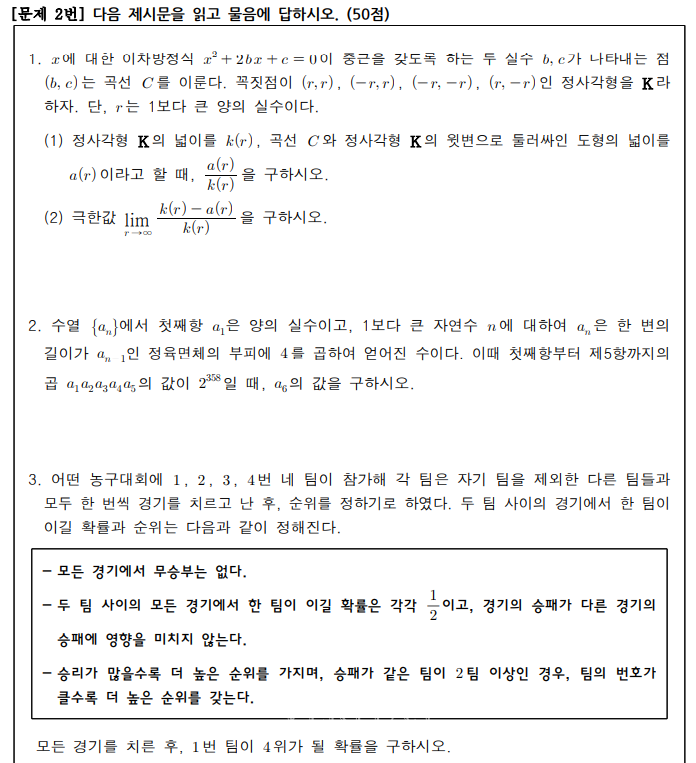 문제2는 교과서 수학 1, 수학 2, 확률과 통계의 주요내용을 다루고 있다. 3개의 소문항으로 구성됐다. 문항1은 이차방정식의 근의 공식을 이해하고 곡선과 직선으로 둘러싸인 도형의 넓이를 정적분을 이용하여 구할 수 있는지를 묻는다. 또한 극한에 대한 지식을 적절히 활용해서 원하는 결과를 이끌어낼 수 있는지를 묻는다. 문항2는 수열의 귀납적 정의를 이해하여 수열을 차례대로 계산하고 등비수열의 합과 지수법칙을 이용하여 값을 정확히 계산할 수 있는지를 묻는다. 문항3은 경우의 수, 여사건의 확률, 확률의 덧셈정리, 사건의 독립과 종속 등의 개념을 포괄적으로 이해하고 있는지를 묻는다.