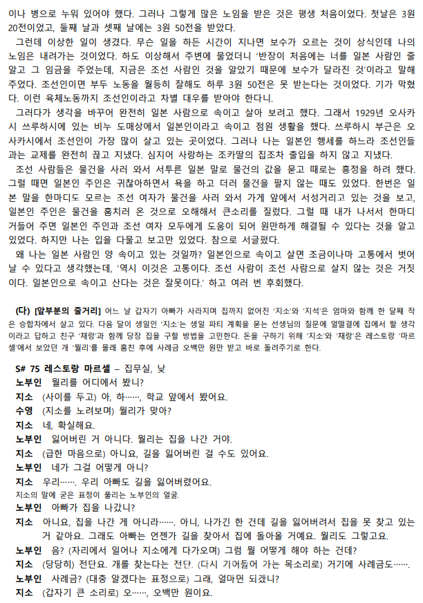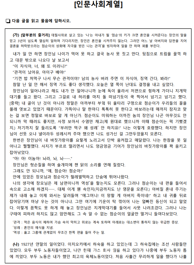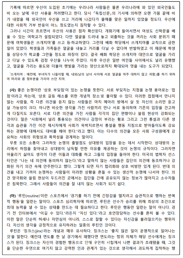 2024모의논술 인문사회계열 몬항을 살펴보면 제시문 10개와 문제3개가 출제됐다. 다른 대학에 비해 제시문 수가 많고 길어 제시문을 제대로 이해하는 것이 중요하다. 제시문(가)는 김유정의 ‘봄 봄’에서 발췌한 글이다. (나)는 이봉창의 ‘이제야 참 조선인이 되었다’에서 발췌했으며 (다)는 바바라 오코너의 ‘개를 훔치는 완벽한 방법’에서 발췌했다. (라)는 고교 ‘윤리와 사상’에 실린 ‘도가 사상의 전개’와 ‘동서양의 다양한 평화 사상’을 출제 의도에 맞게 발췌해 일부 편집/수정했다. (바)는 김진섭의 글 ‘우산, 근대와 전근대가 만나다’에서 발췌했으며 (사)는 고교 ‘독서’ 교과서에 실린 박성희의 ‘의견 양극화와 생산적 논쟁’의 일부를 발췌한 글이다. (아)는 고교 ‘화법과 작문’ 교과서에 실린 ‘피하고 싶은 ‘징크스’와 해야만 하는 ‘루틴’’의 일부를 출제 의도에 맞게 발췌한 글이다. (자)는 ‘국어’ 교과서에 실린 ‘어느 아마추어 전문가처럼’을 발췌했으며 (차)는 ‘문학’ 교과서에 실린 ‘아무도 모르라고’를 발췌해 출제 의도에 맞게 일부 편집한 글이다.