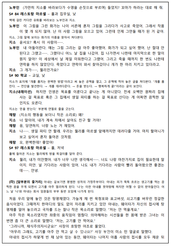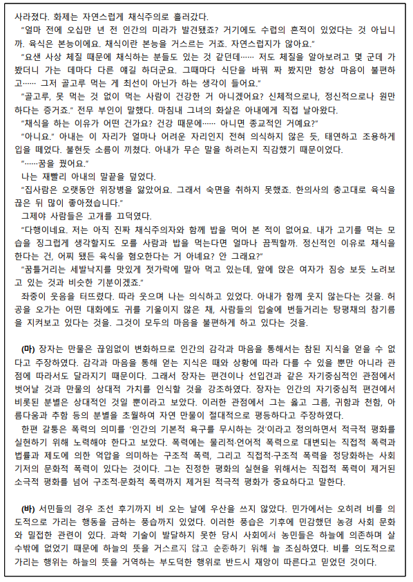 문제2는 제시문 (마)와 (바)를 통합적으로 고려해 (라)의 채식주의자 ‘아내’에 대한 모임 참석자들의 태도를 비판하는 것이 24점, (라)의 ‘아내’와 모임 참석자들이 서로를 이해하기 위해 각각 어떠한 노력을 해야 하는지를 제시문 (사)를 토대로 서술하는 것이 16점 배점이었다. 글의 논지를 파악하고 이를 통합해 참석자들의 태도를 비판해야 했으며 (사)의 내용을 토대로 참석자와 아내가 각각 가져야 할 태도를 정확하게 기술해야 좋은 점수를 받을 수 있었다.