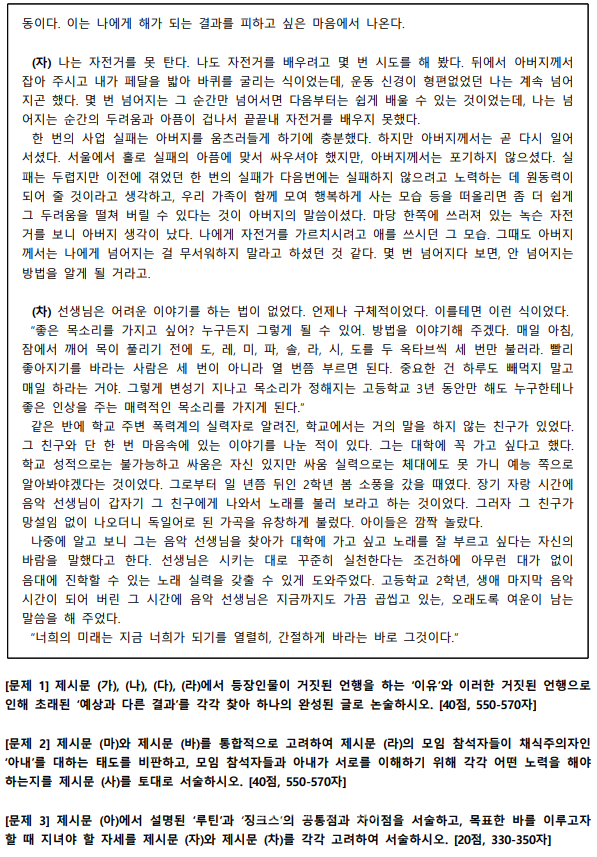 문제3은 제시문 (아)에서 ‘루틴’과 ‘징크스’의 공통점과 차이점을 모두 서술해야 했다. 또한 제시문 (자)와 (차)에서 목표한 바를 이루기 위해 필요한 자세를 모두 찾아 서술했을 경우 좋은 점수를 받을 수 있었다.