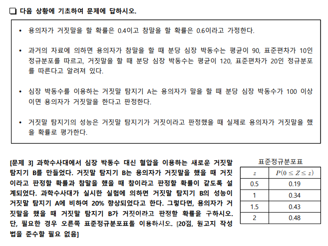 정규분포의 확률을 계산할 수 있는지를 평가하는 문항이었다. 거짓말 탐지기 A가 거짓이라고 판정하였을 때, 실제로 용의자가 거짓말을 하였을 확률을 올바르게 계산한 경우 좋은 점수가 주어졌다. 계산 실수로 틀렸어도 논리 전개 과정이 맞으면 해당 부분에 1~2점의 부분 점수를 부여하며 각 부분에서 바르게 답안을 작성한 경우에도 답안의 완성도에 따라 총점 20점 이내에서 ±1점