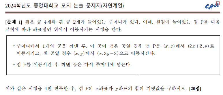 [베리타스 알파=신현지 기자] 2024중앙대 논술은 어떻게 출제될까. 중대는 올해 논술에서 기존 자연계의 과학논술을 폐지하고 수학논술만 본다. 수학논술 출제범위에 확률과통계가 추가돼 수학 수학Ⅰ 수학Ⅱ 미적분 기하 확통의 수학 전 범위에서 출제된다. 수학논술 출제 문항 수도 기존 3문항에서 4문항으로 확대된다.