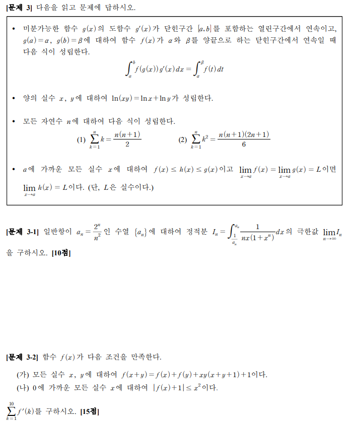 문제3의 소문항1은 정적분을 구할 때 적분을 하는 함수를 적절한 형태로 변형을 한 후 치환적분을 계산할 수 있는지를 평가하는 문제이다. 그리고 이렇게 얻은 정적분 값에 대한 수열의 극한을 구할 수 있는 지도 평가한다. 소문항2는 함수의 특성과 극한의 성질을 활용해 미분계수를 정확하게 찾아낼 수 있는지를 묻는 문제이다. 특히 함수의 극한의 대소 관계를 이용하여 극한을 구할 수 있는지 평가한다.