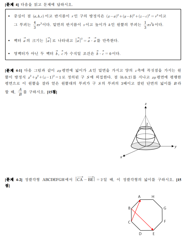 문제4의 소문항1은 공간좌표에서 표현되는 공간도형의 특성을 잘 파악하고 있는지 평가한다. 구에 외접하는 원뿔대를, 그 중심축을 지나는 평면으로 절단해 얻은 단면을 이용해 3차원의 문제를 2차원 문제로 변환하여 해결하는 능력을 평가한다. 또한 피타고라스 정리와 삼각형의 닮음을 상황에 맞게 적용할 수 있는 능력을 평가한다. 소문항2는 벡터를 다양한 방법으로 다룸으로써 도형을 식으로 표현하고 이해할 수 있는지 평가한다. 벡터의 길이와 내적과의 관계, 두 벡터의 수직 조건을 이용해 문제를 해결할 수 있는 능력을 평가한다.