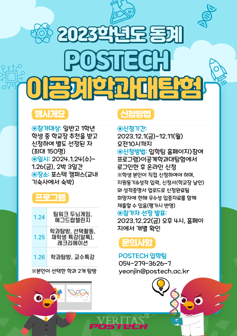 [베리타스알파=김해찬 기자] 포스텍이 고1대상 2023 동계 이공계학과대탐험을 내년1월24일부터 26일까지 2박3일간 포스텍 캠퍼스에서 실시한다고 최근 밝혔다. 팀워크를 기르기 위한 협업기반 활동, 희망 2개 학과의 체험/탐방, 재학생 토크콘서트와 동아리 공연, 교수 특강 등이 예정돼 있다.