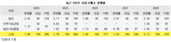올해 서울 국제고의 경쟁률은 1.9대1(90명/218명)로 지난해보다 상승했다. 최근 5년간 경쟁률을 살펴보면 2020학년 2.13대1(150명/319명), 2021학년 1.52대1(150명/228명), 2022학년 1.45대1(150명/217명), 2023학년 1.76대1(150명/264명)대1, 2024학년 1.9대1 순의 흐름이다. 2022학년 이후 3년 연속 상승세를 이어가는 모습이다.