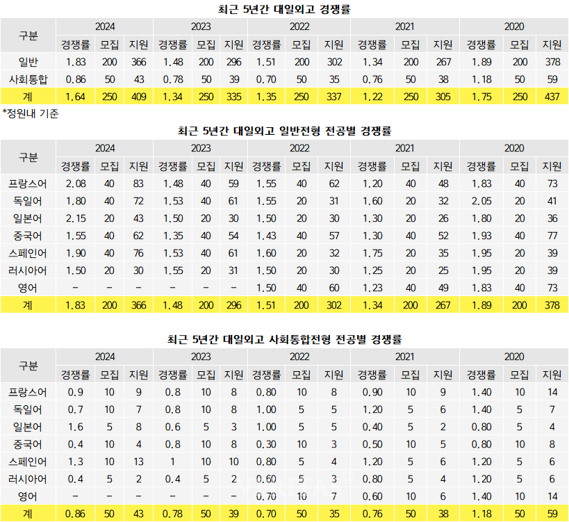 일반기준 전공별로는 일본어가 2.15대1(20명/43명)로 가장 높았다. 프랑스어 2.08대1(40명/83명), 스페인어 1.9대1(40명/76명), 독일어 1.8대1(40명/72명), 중국어 1.55대1(40명/62명), 러시아어 1.5대1(20명/30명) 순이다.