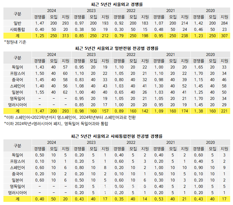 사회통합 전공별 경쟁률은 스페인어와 일본어가 각 10명 모집에 6명이 지원하면서 0.6대1이다. 이어 독일어 0.5대1(10명/5명), 중국어 0.2대1(10명/2명), 프랑스어 0.1대1(10명/1명) 순이다.