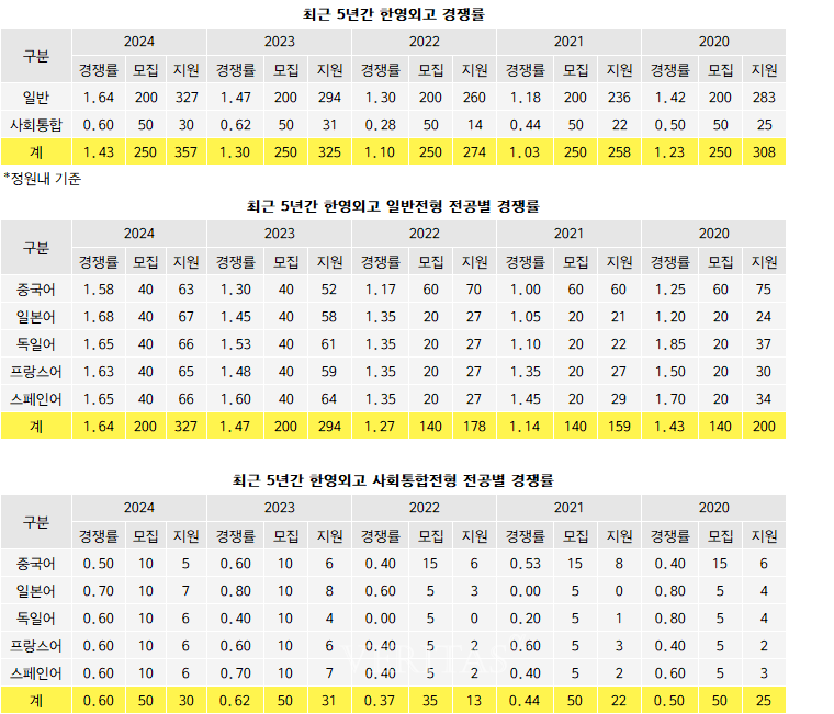 올해 한영외고의 경쟁률은 1.43대1(250명/357명)로 지난해 1.3대1(250명/325명)보다 상승했다. 최근 5년간 경쟁률은 2020학년 1.23대1(250명/308명)에서 2021학년 1.03대1(250명/258명)으로 하락했다가 2022학년 1.1대1(250명/274명), 2023학년 1.3대1(250명/325명), 2024학년 1.43대1(250명/357명) 순으로 점진적으로 상승했다.